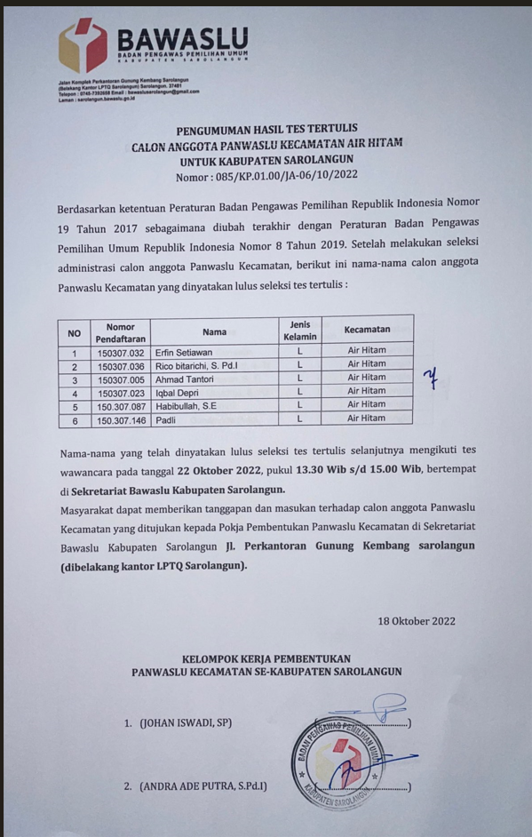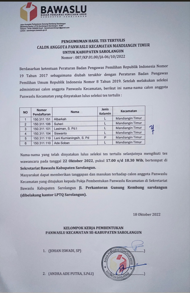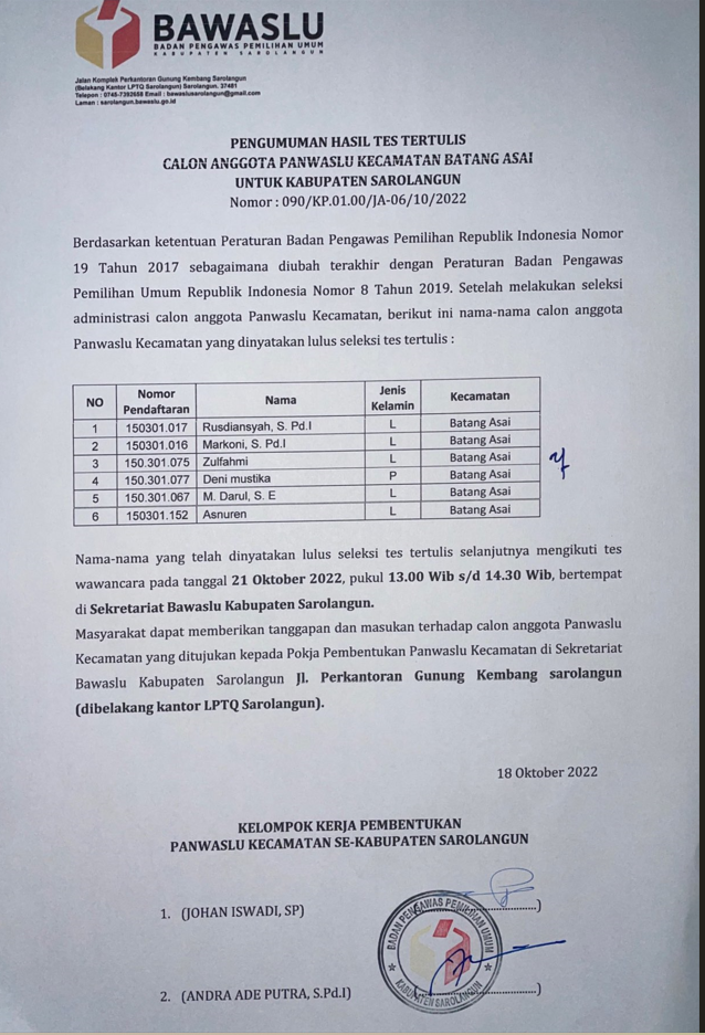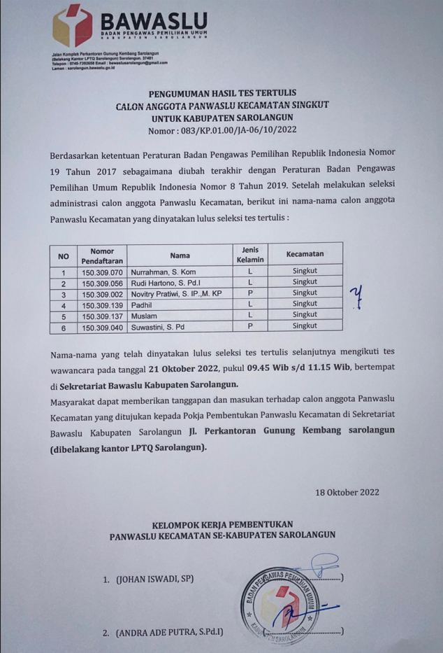Pengumuman Hasil Tes Tertulis Calon Anggota Panwaslu Kecamatan Sarolangun Untuk Kabupaten Sarolangun