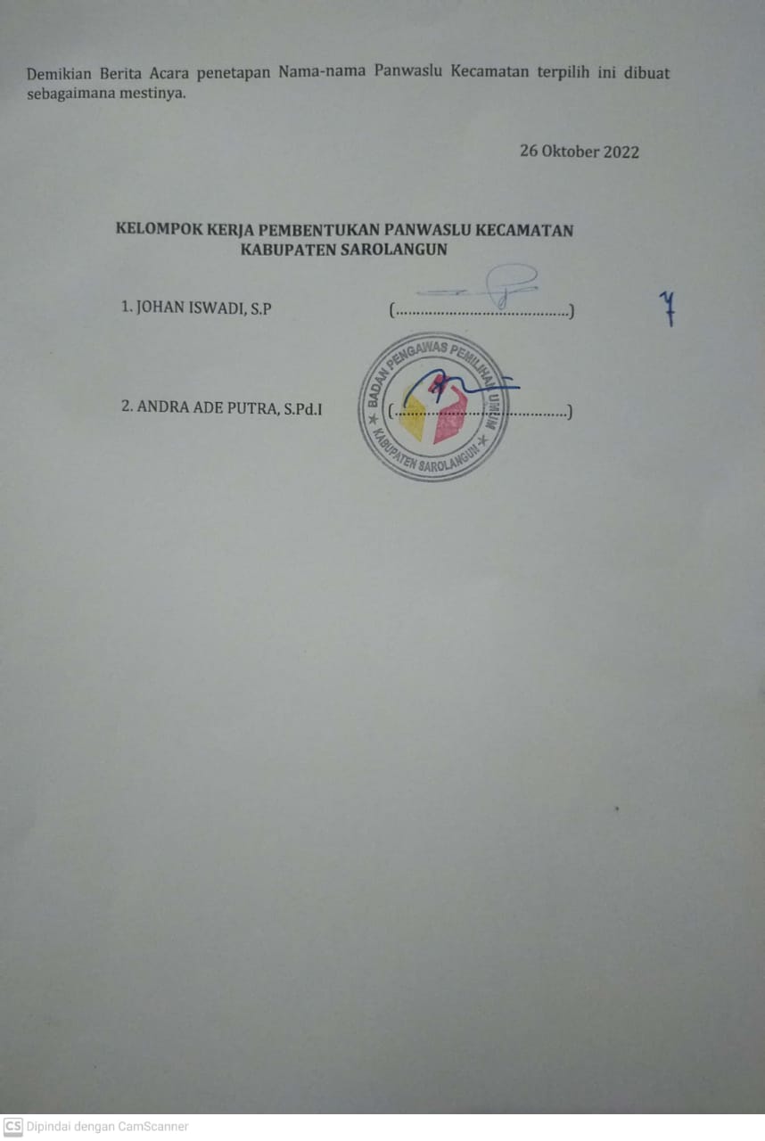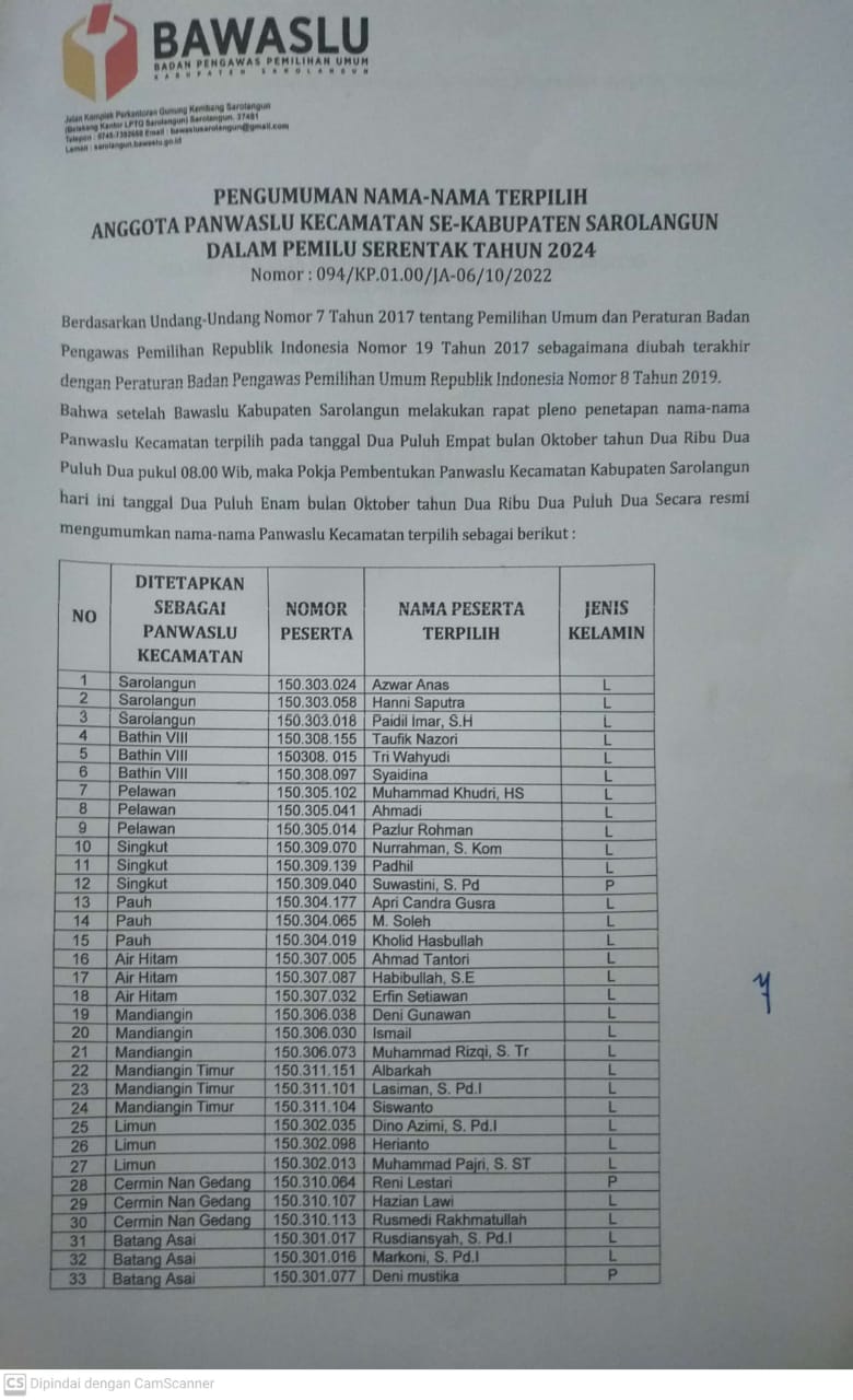 Berdasarkan undang- undang nomor 7 tahun 2017 tentang pemilihan umum dan peraturan Badan pemilihan Republik Indonesia Nomor 19 Tahun 2017 sebagaimana di ubah terakhir dengan Peraturan Badan Pengawas Pemilihan Umum Nomor 8 Tahun 2019. Bahwa setelah Bawaslu Kabupaten Sarolangun melakukan rapat Pleno Penetapan nama-nama Panwaslu kecamatan Terpilih pada tanggal Dua puluh Empat Bulan Oktober Tahun Dua ribu Dua Puluh Dua Pukul: 08.00 Wib, Maka Pokja Pembentukan Panwaslu kecamatan Kabupaten Sarolangun Hari ini Tanggal Dua Puluh Enam Bulan Oktober Tahun Dua ribu dua Puluh Dua Secara Resmi mengumumkan nama-nama Panwaslu Kecamatan terpilih sebagai berikut: