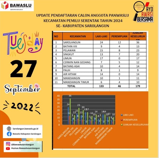 Dalam rangka pembetukan Panwaslu Kecamatan pada Pemilu Serentak tahun 2024, Kelompok Kerja Pembentukan Panwaslu Kecamatan Kabupaten Sarolangun berdasarkan Peraturan Badan Pengawas Pemilihan Umum Republik Indonesia Nomor 19 Tahun 2017 sebagaimana diubah terakhir dengan Peraturan Badan Pengawas Pemilihan Umum nomor 8 tahun 2019, atas Kewenangan yang diberikan oleh undang-Undang Nomor 7 Tahun 2017, Membuka Kembali dan memberi kesempatan bagi warga negara Indonesia yang memenuhi persyaratan untuk mendaftarkan diri sebagai calon anggota Panwaslu Kecamatan, di Kecamatan yang akan dilakukan perpanjangan yang belum memenuhi kuota 30% keterwakilan Perempuan namun tetap terbuka untuk umum ( Putra dan Putri) Yaitu Kecamatan Limun,Kecamatan Batang Asai, Kecamatan Pauh,Kecamatan Air hitam dan Kecamatan Mandiangin